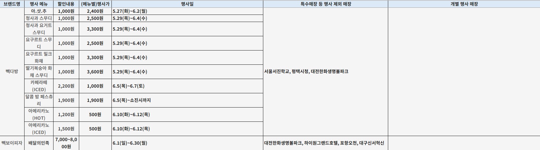 | 빽다방 | 인기 음료 릴레이 할인 | 월~금 | 최대 50% 할인 |