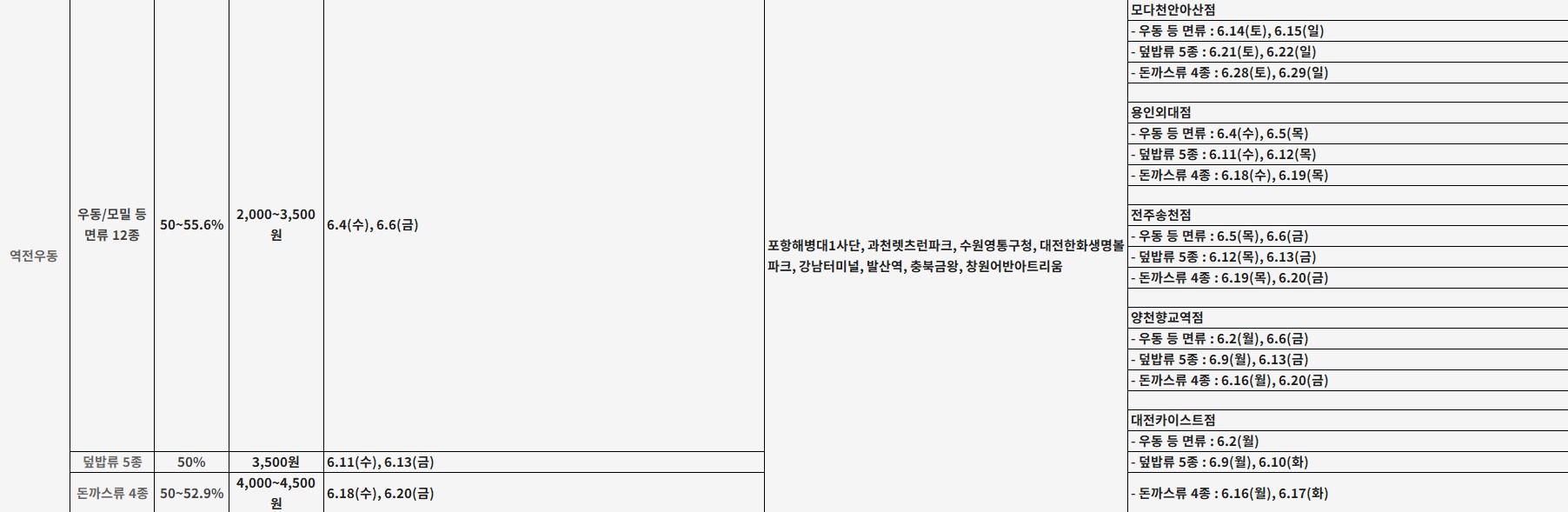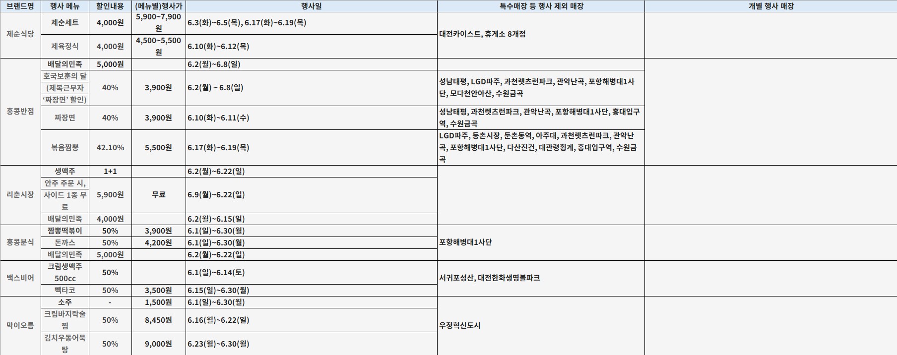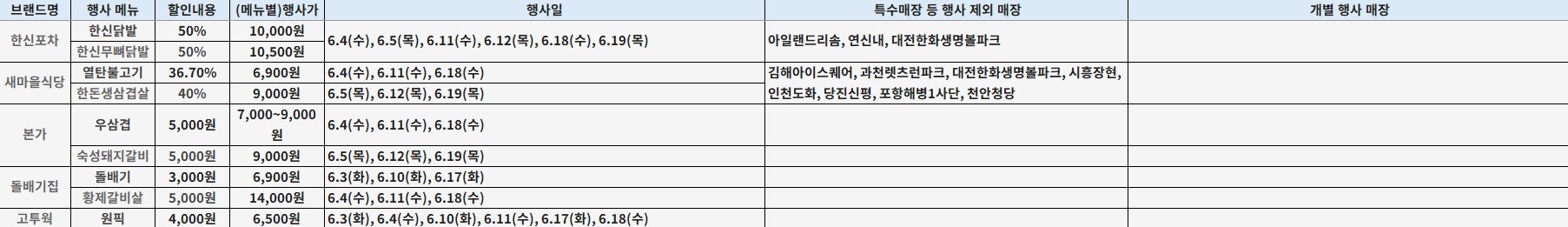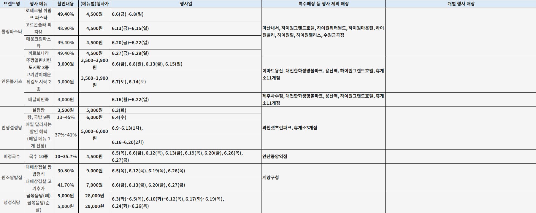 | 브랜드 | 이벤트 내용 | 요일 | 할인 방식 |