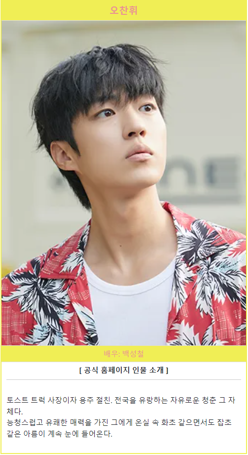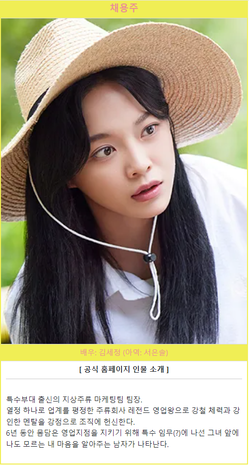 - 채용주 (김세정): 주류회사에서 일하는 영업왕으로, 열정과 끈기로 업계를 평정한 인물입니다.