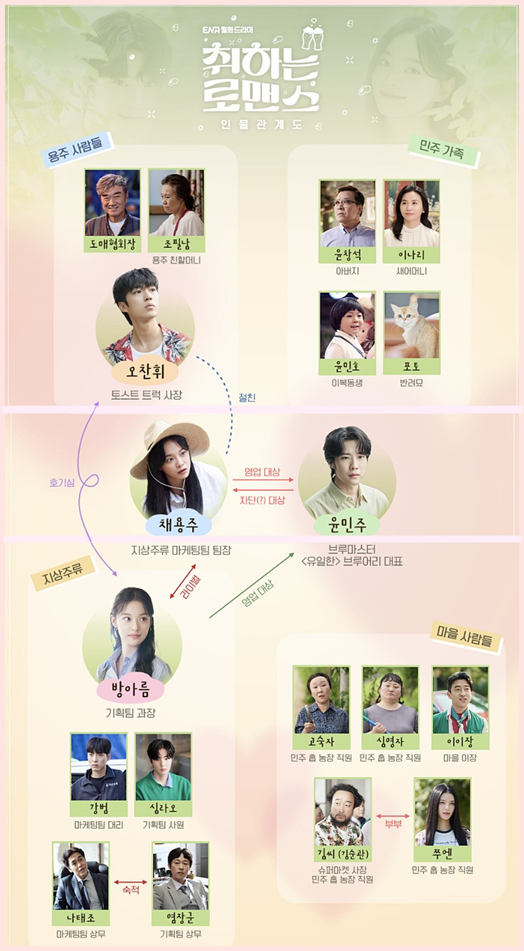 '취하는 로맨스'는 주류업계의 이야기를 중심으로 한 로맨스 드라마입니다. 주인공들은 각자의 꿈과 목표를 가지고 있으며, 그 과정에서 사랑과 우정, 그리고 갈등을 겪게 됩니다. 이 드라마는 현대 사회에서의 젊은이들의 삶을 사실적으로 그려내어 많은 공감을 불러일으키고 있습니다.