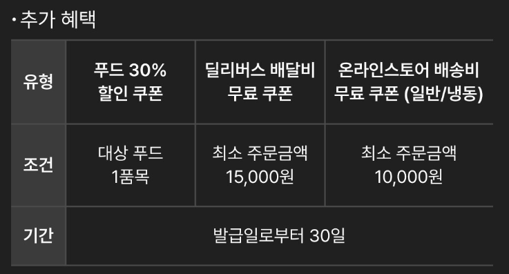 - 푸드 30% 할인 쿠폰의 경우, 홀케이크, 초콜릿, 패키지 푸드, 세트 메뉴 등 일부 푸드가 제외됩니다.