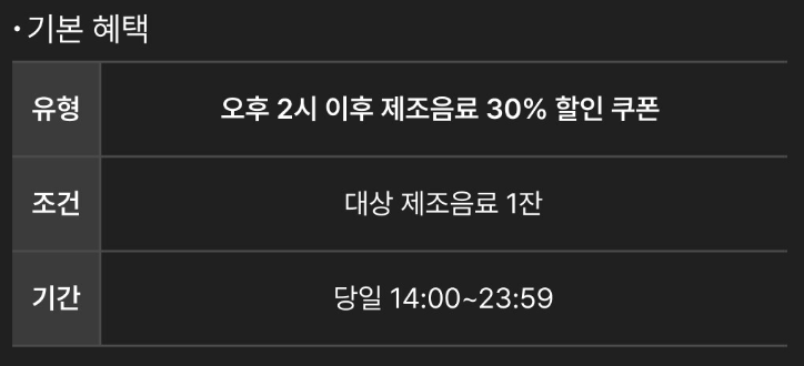 - 오후 2시 이후 제조음료 30% 할인 쿠폰의 경우, 리저브 음료, To Go Bag, 알코올 음료, 프로모션 음료, 유료 퍼스널 옵션 등 일부 할인이 제외됩니다.