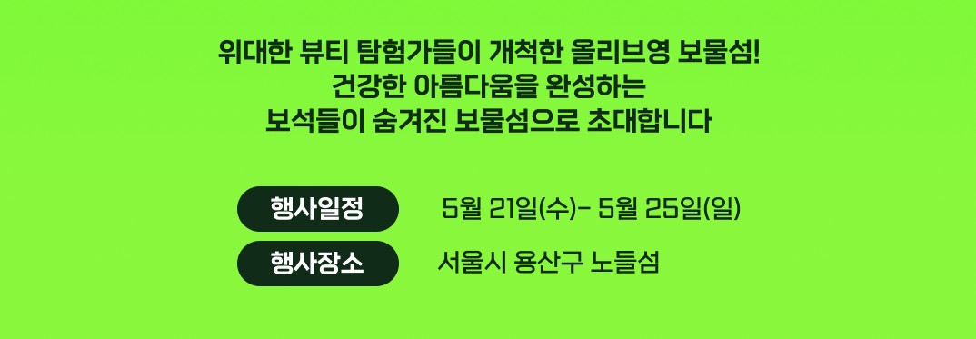 2025년 올리브영 페스타는 5월 21일(수)부터 5월 25일(일)까지 서울 노들섬에서 개최됩니다. 노들섬은 아름다운 자연경관과 함께 다양한 문화행사를 즐길 수 있는 장소로, 이번 페스타의 분위기를 한층 더 고조시킬 것입니다. 이 기간 동안 다양한 브랜드의 부스와 프로그램이 마련되어 있어, 방문객들은 다채로운 경험을 할 수 있습니다.