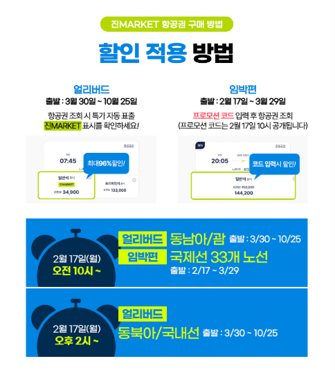 이번 진마켓에서는 최대 96%의 운임 할인이 적용됩니다. 국내선의 경우 편도 총액이 최저 1만 원대에 항공권을 예매할 수 있어, 여행을 계획하는 분들에게는 매우 매력적인 기회입니다. 해외 노선에서도 큰 폭의 할인이 적용되므로, 여행을 꿈꾸는 분들은 이번 기회를 놓치지 않으시길 바랍니다.