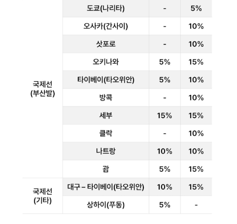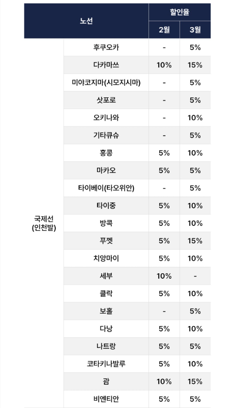 각 노선별 할인율은 다르게 적용됩니다. 예를 들어, 동남아 노선은 최대 90% 이상의 할인율이 적용되며, 동북아 노선은 80% 이상의 할인율이 적용됩니다. 이러한 할인율은 항공권의 예약 시점에 따라 달라질 수 있으니, 빠른 예약이 필요합니다.