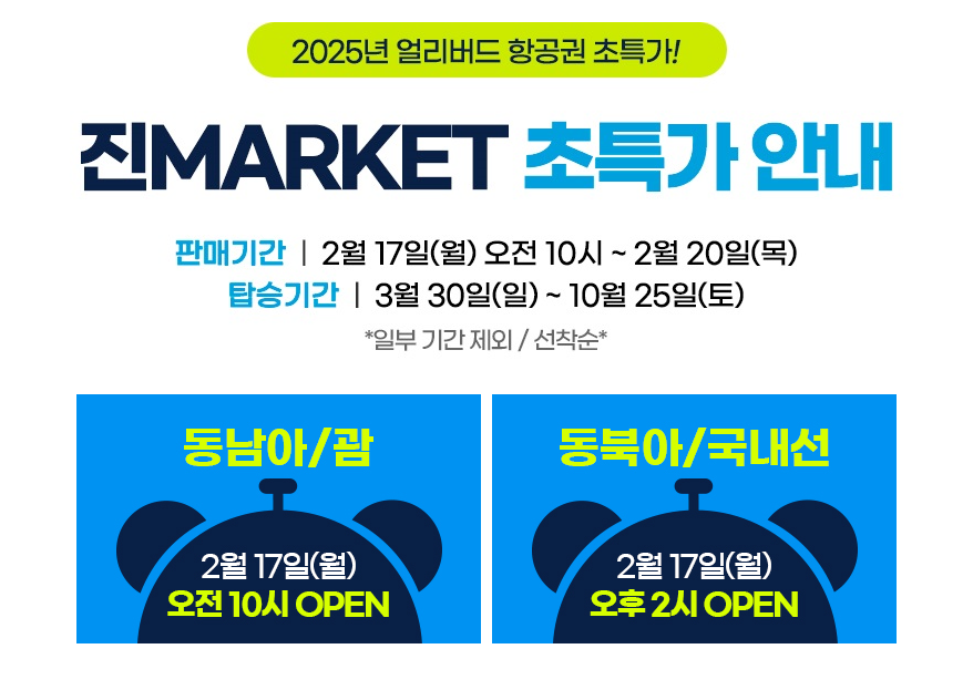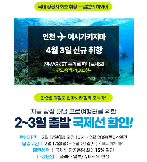 진에어는 2025년 상반기를 맞아 특별한 할인 이벤트인 '진마켓'을 진행합니다. 이 이벤트는 17일부터 20일 자정까지 진행되며, 다양한 노선에서 할인된 항공권을 구매할 수 있는 기회를 제공합니다. 특히, 오전 10시부터는 동남아 및 괌 노선의 할인 항공권이 오픈되며, 오후 2시부터는 동북아 노선의 할인 항공권이 제공됩니다.