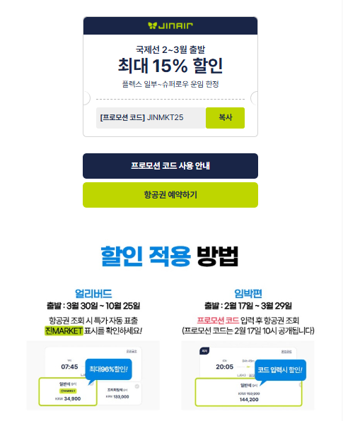 할인을 적용받기 위해서는 진에어 공식 홈페이지나 모바일 앱을 통해 예약을 진행해야 합니다. 예약 시, 할인 코드나 프로모션 링크를 입력하면 자동으로 할인이 적용됩니다. 또한, 진에어페이, 카카오페이 등 다양한 결제 수단을 통해 더욱 편리하게 결제할 수 있습니다.