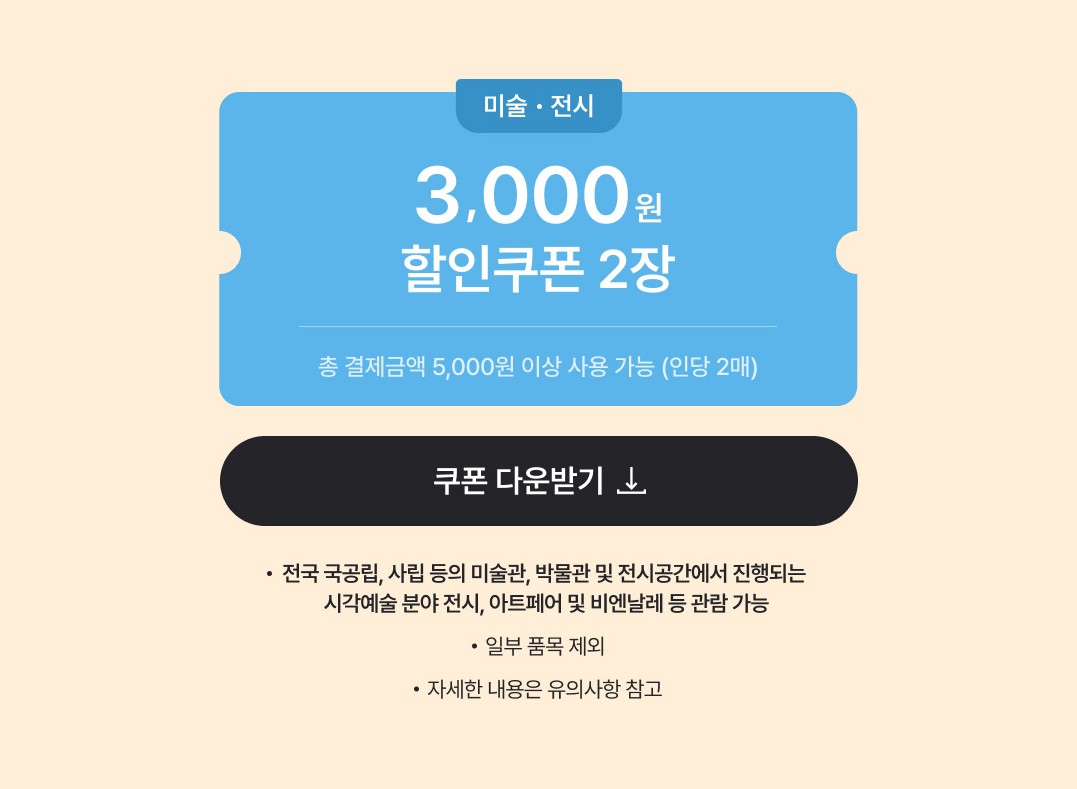 | 미술·전시 | 3,000원 | 2장 | 총 결제금액 5,000원 이상 |