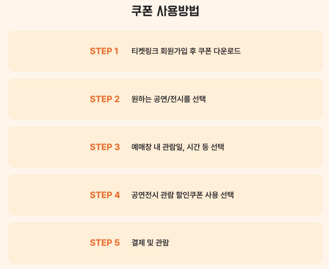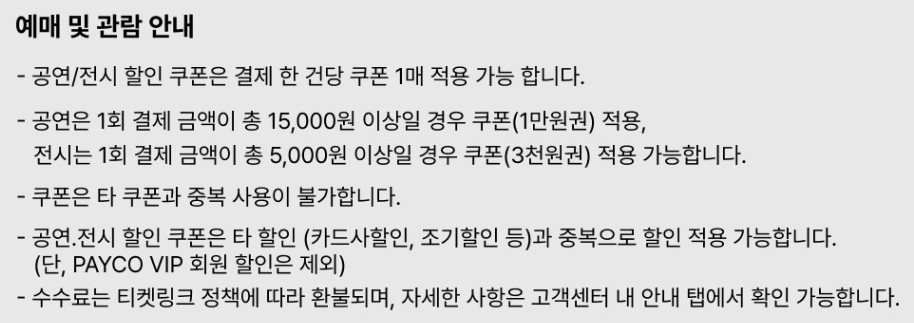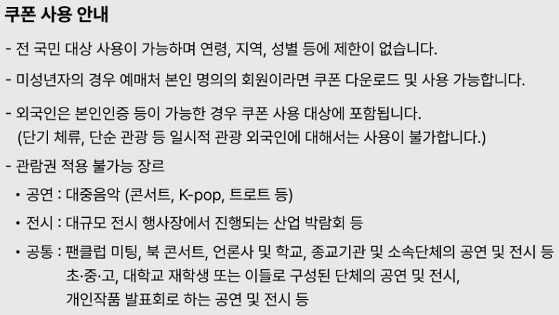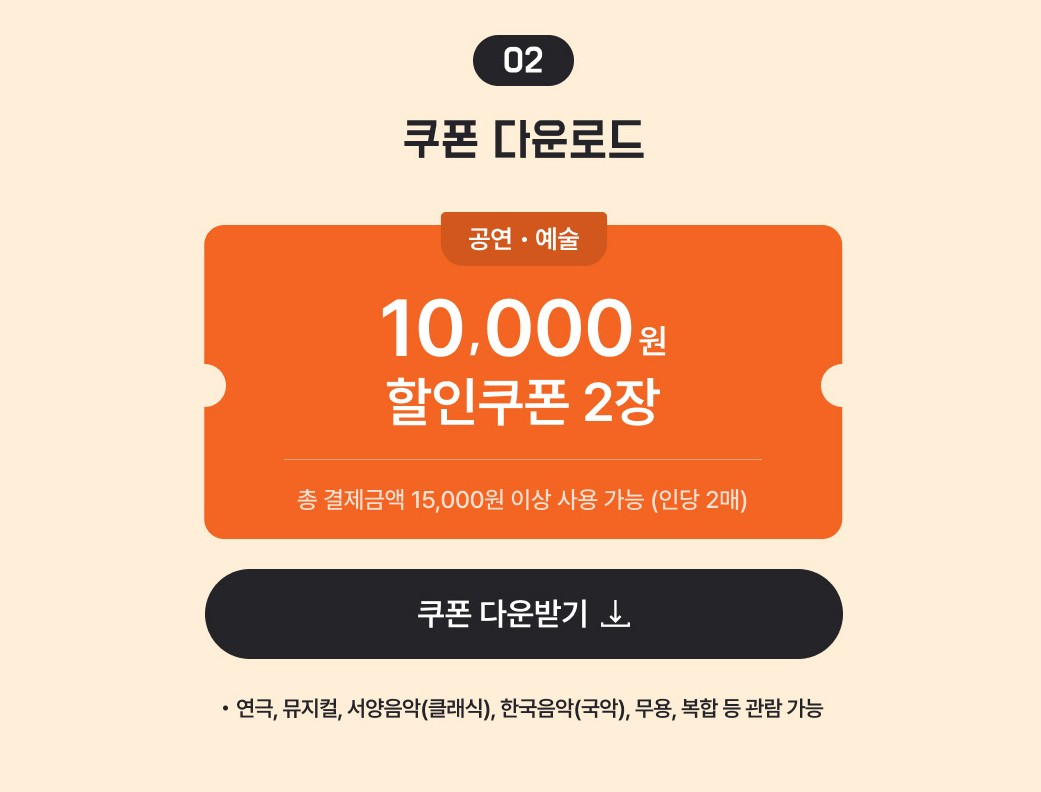 - 공연: 15,000원 이상 결제 시 10,000원 쿠폰 적용