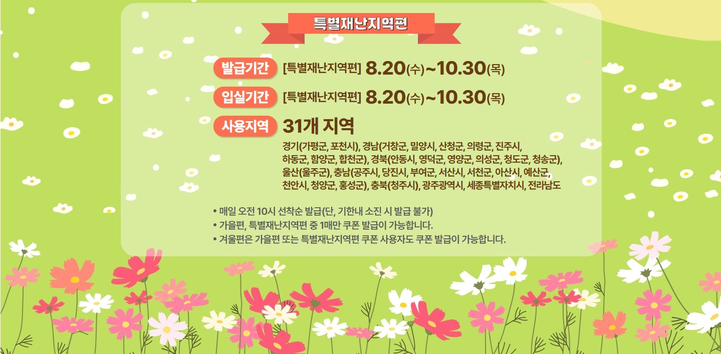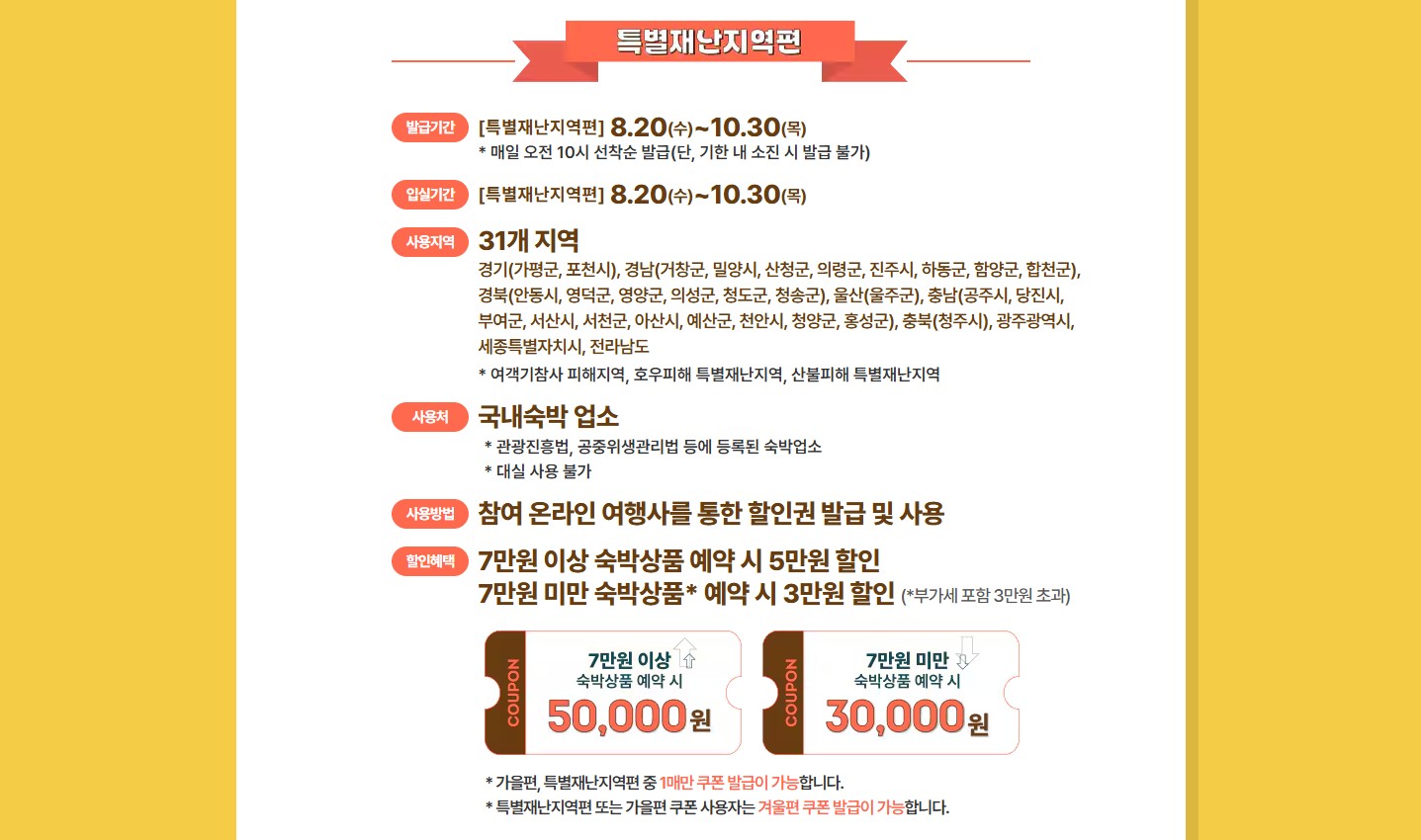 | 특별재난지역편 | 8.20 ~ 10.30 | 8.20 ~ 10.30 | 7만 원 이상: 5만 원 7만 원 미만: 3만 원 |