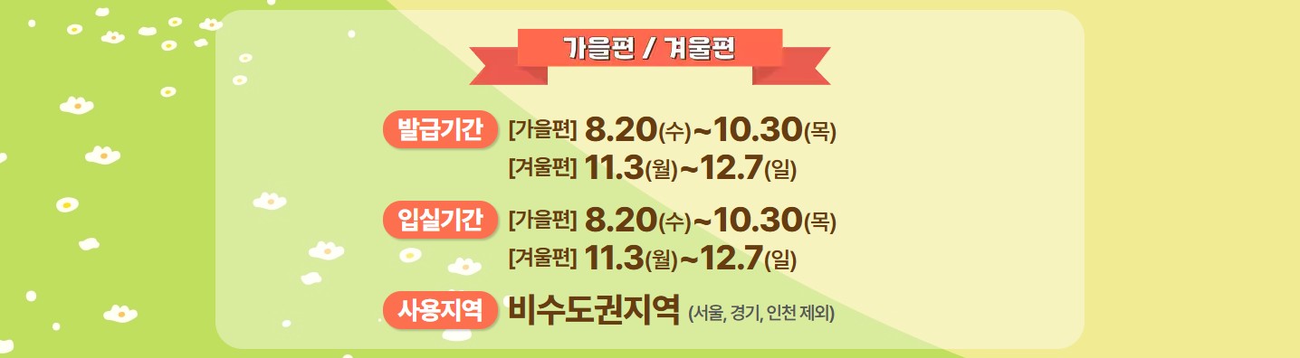 | 가을편 | 8.20 ~ 10.30 | 8.20 ~ 10.30 | 7만 원 이상: 3만 원 7만 원 미만: 2만 원 |