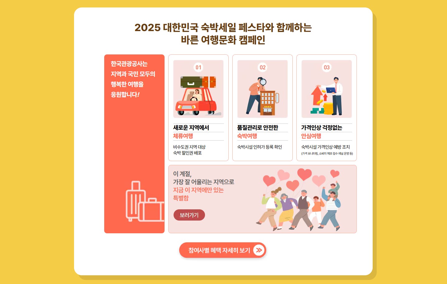 2025 숙박세일 페스타는 단순한 할인 이벤트가 아닙니다. 전국 곳곳의 숨은 여행지를 더 저렴하게, 더 편하게 즐길 수 있는 기회입니다.